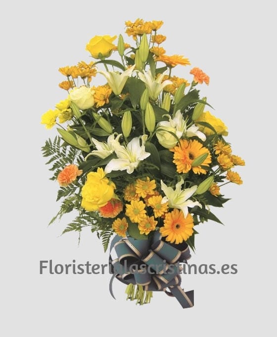 Bonito, de aire silvestre, este Ramo Funerario tonos Amarillos. Es un ramo de defunción, de flores para difuntos variadas, en tonos amarillos, confeccionado con rosas, gerberas, claveles, paniculata y verdes variados que le dan al ramo para tanatorio un aire primaveral y silvestre (incluye Rosas, gerberas, lilium, margaritas, verdes variados, celofán, lazo y cinta funeraria).